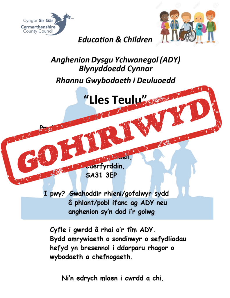 Os oes unrhyw beth yn anghywir neu allan o ddyddiad neu gall gael ei gynnwys yma anfonwch e-bost atom: gwybplant@sirgar.gov.uk