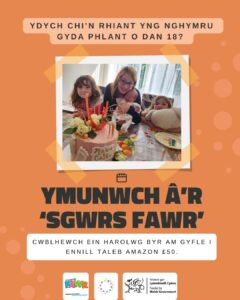 Mae’n eithaf tebygol mai bod yn rhiant fydd un o’r rolau fydd yn rhoi’r boddhad mwyaf ichi ac weithiau, yn un o’r rolau mwyaf heriol hefyd! Am y rheswm hwnnw, mae gennym amrywiaeth o gweithdau i gefnogi mamau, tadau a gofalwyr. Fel arfer, cynhelir ein gwiethdau mewn canolfannau plant neu ganolfannau teulu lleol ac maent yn llefydd hwyliog ac yn anffurfiol ac yn bwysicach na hynny, am ddim!