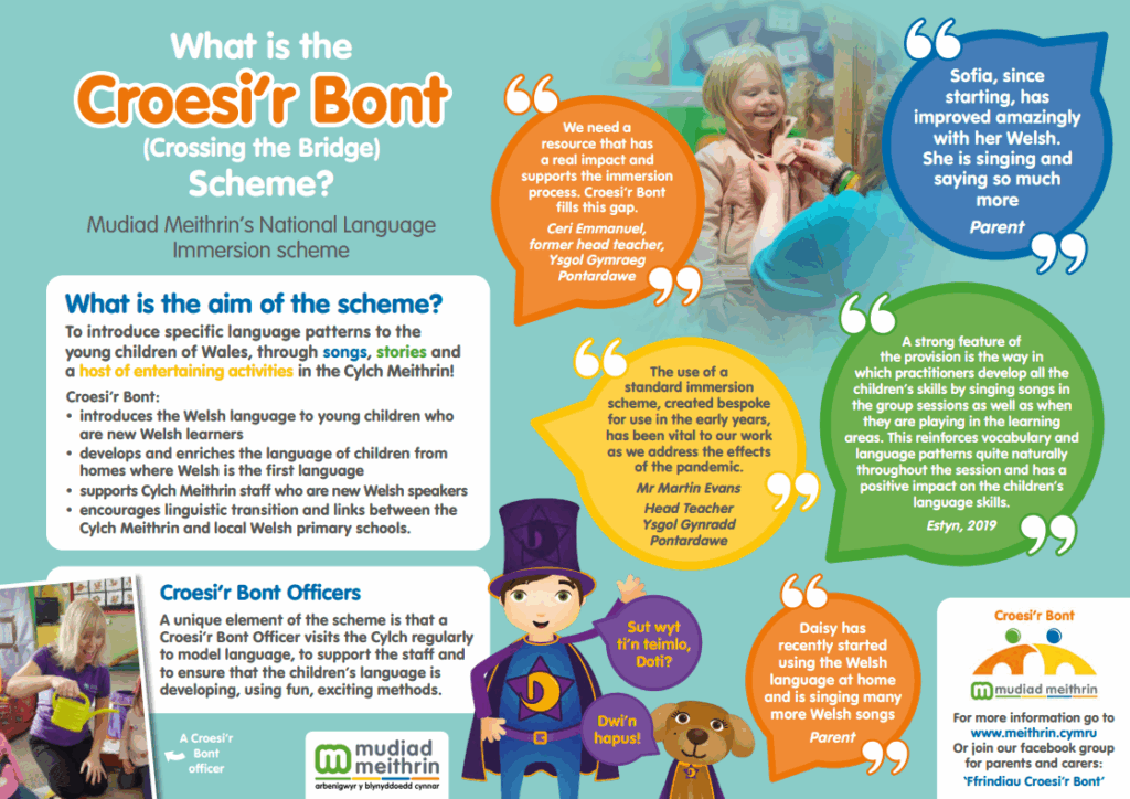 Cynllun Plethu is a partnership project between Early Years Wales & Mudiad Meithrin that identifies promising English or bilingual childcare settings and supports them in progressing toward full Welsh-medium immersion.