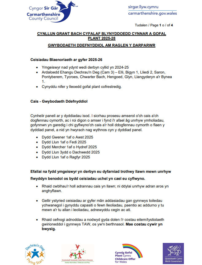 - Gwahoddir ceisiadau ar sail y cyntaf i’r felin tan 30ain o Dachwedd 2025 neu nes bod yr holl arian wedi’i ddyfarnu, pa bynnag un ddaw gyntaf.